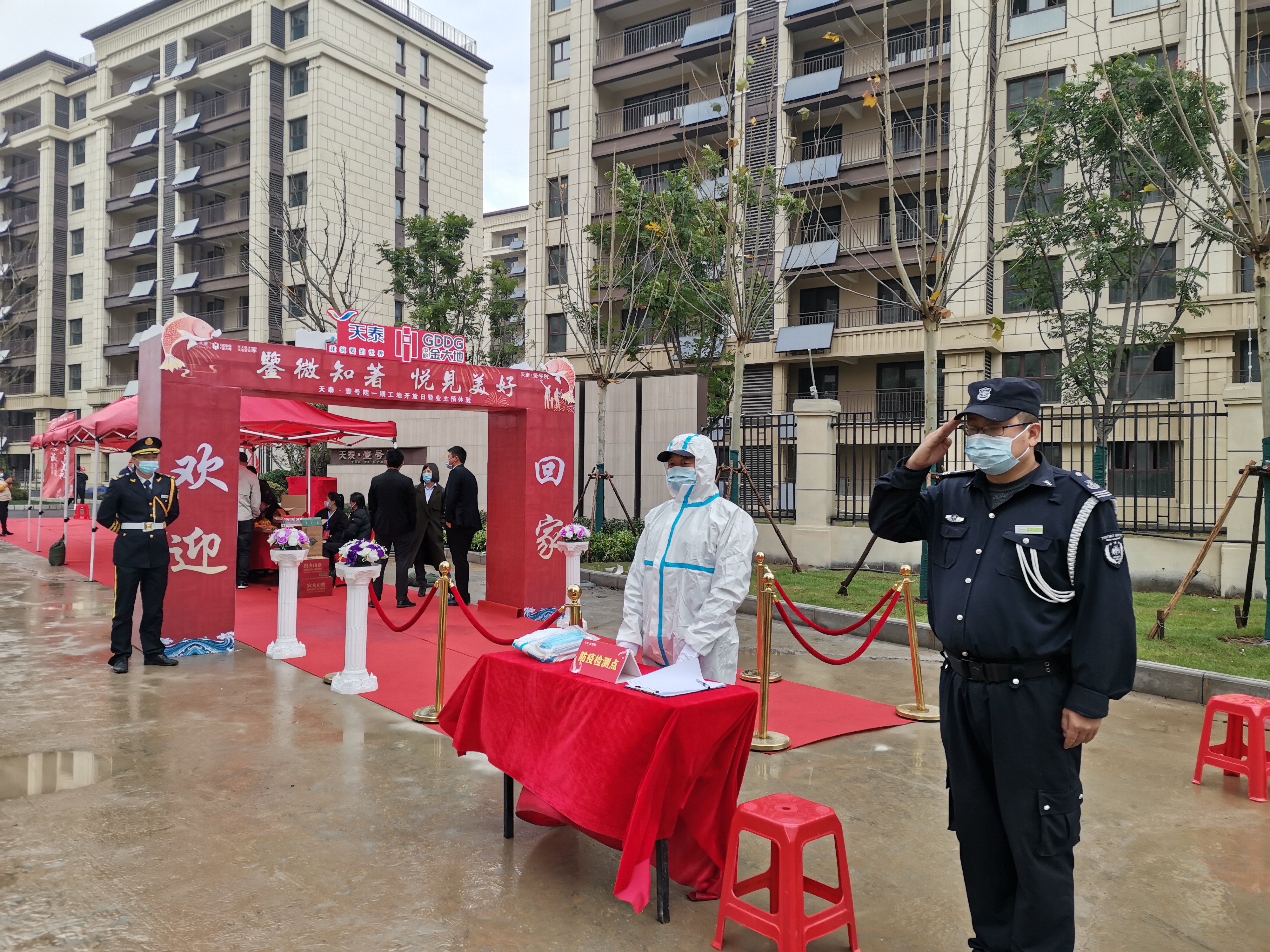 活动入口增设防疫点,设一米线、专人查阅健康码、测体温,并在活动区域内酒精消毒,并在签到处准备防疫物资,确保每个细节都完美而周到,无不彰显着天泰·金大地至真至诚的服务理念。对于期盼已久的业主而言,龙门架及单元门“欢迎回家”四个字是最动听的情话,活动入口服务人员,为到场的业主们送上最真挚的问候,“欢迎回家”,让到来的业主在进门前感受到回家的温暖,亲切、高效的服务得到了业主们的认可。